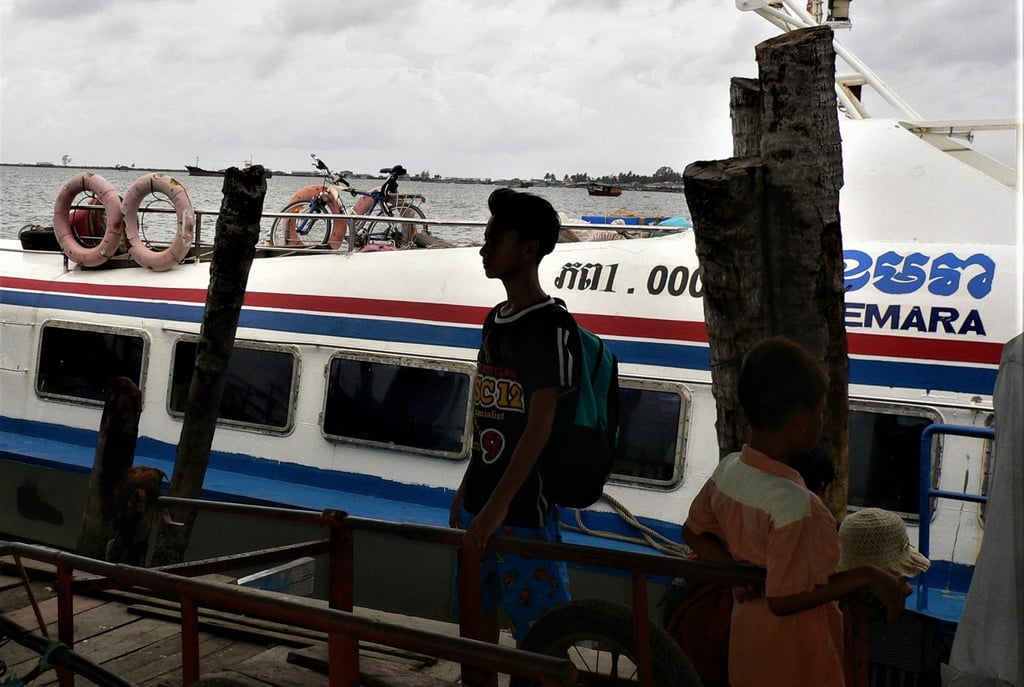 To get from Sihanoukville to Thailand you have to get a hydrofoil to a place called Koh Kong, (it’s the province as well as an island; it is so remote here that there are no roads), then you get a small boat or a taxi to Hat Lek at the border, then a bus to wherever you want, the next big town being Trat – or start cycling of course. I get to the quay early next day and have my passport stamped in the customs shack. The hydrofoil is like the ones they use on the Saigon River. They are 25-year-old Russian jobs that used to ply their trade on the Volga River. Rust buckets really but with a lick of paint, who would know. I do not get a good feeling about this. I am not of great sea-faring stock, I can get sick on the pedal-swans on the lake, so I normally position myself somewhere where there will be a supply of fresh air. On this craft, I can see that they are going to batten down the hatches so I sit in the first row right in front of the air-conditioner and I won’t budge even though my ticket says row 23.