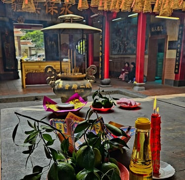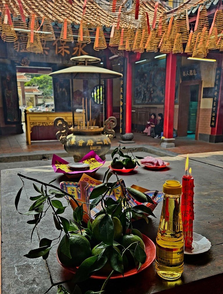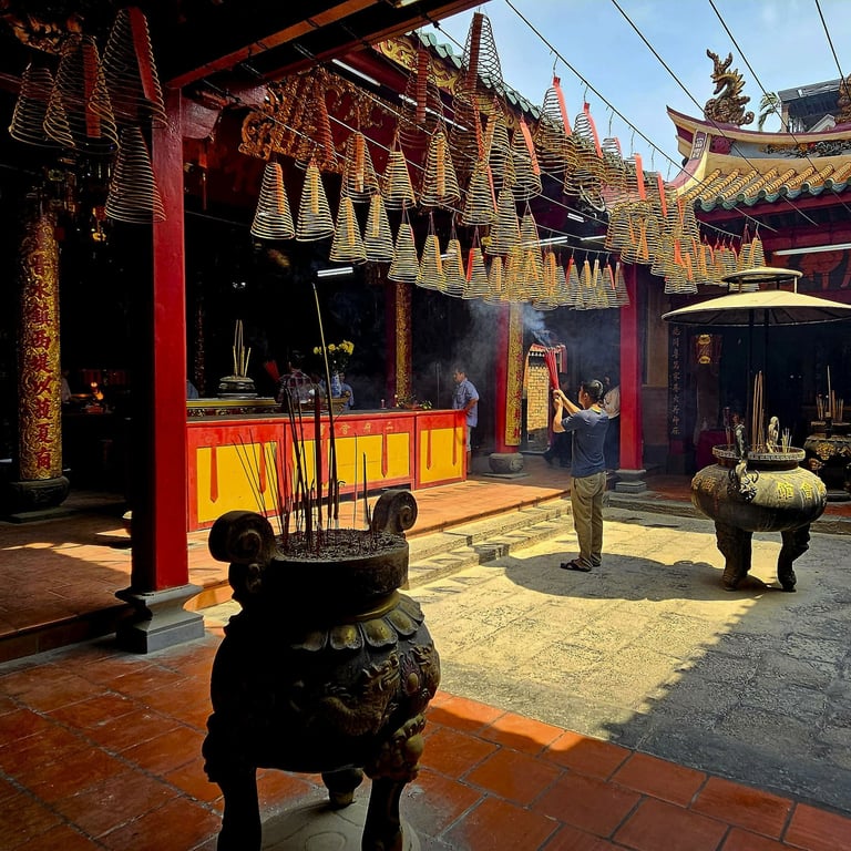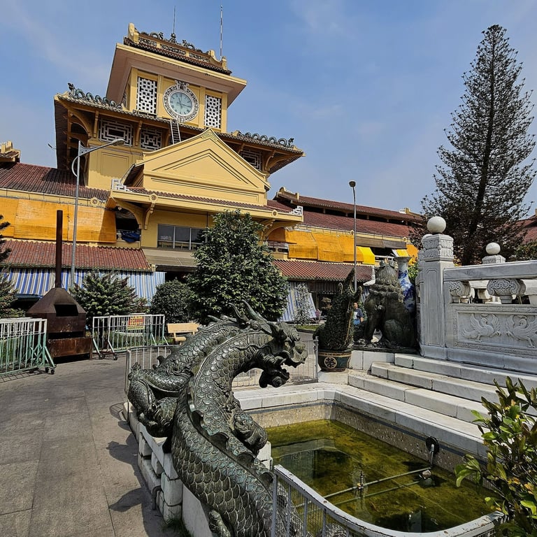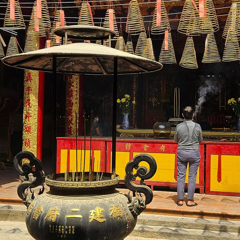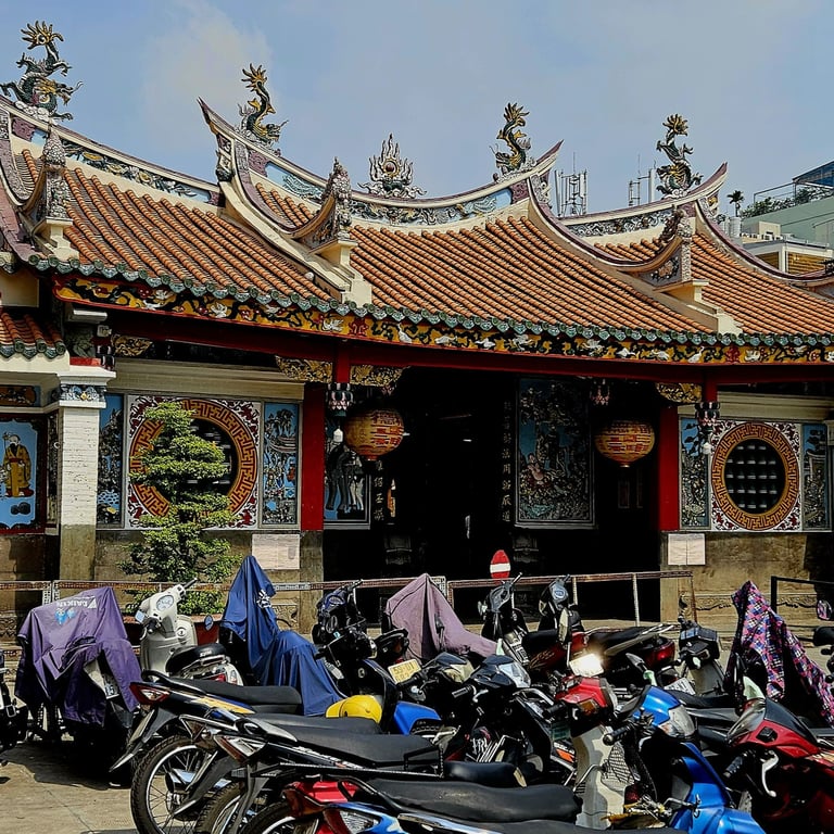 Ong Bon Pagoda in Cholon dates from 1730 when it was constructed by Chinese immigrants from Fujian Province. The pagoda is dedicated to the god, Ong Bon, who protects land and people. Walking around, it is clear that the architecture is very simple with wooden frames and tiled decoration on the roof and eaves. The pagoda presents as solemn and functional, being still very much a part of community life. Footsteps echoing in corridors sound purposeful, like they are running late on their way to some committee meeting or other - a scolding in the offing?