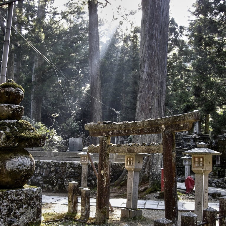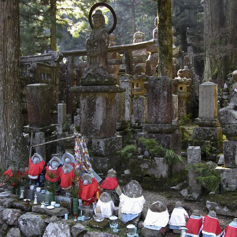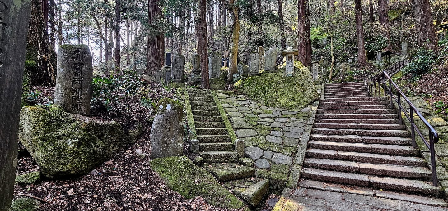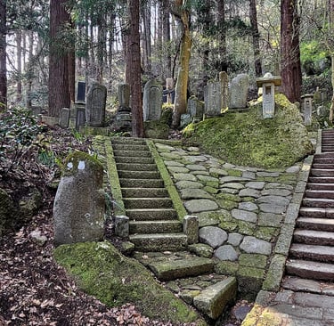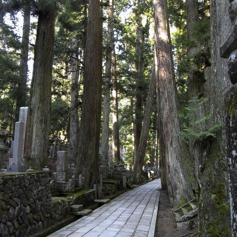 Koyasan, 85 kms south of Osaka, is the name of the mountain as well as the temple settlement that is located there, at 3,000 feet up. It was established as a sacred site in 819 and became the focus for the Shingon Buddhist sect, with the Kongobuji Temple as their world headquarters. There are now 100 temples or more on Koyasan; the Okunoin Cemetery which was opened in 835 is also of world renown. The modern section hosts corporate mausoleums for founders’ family members, such as the Matsushitas of Panasonic, and honoured company employees. The two-kilometre walk among the tall conifers (planting started in the year 1012) in dappled light is very atmospheric as you pass countless headstones and vaults.