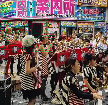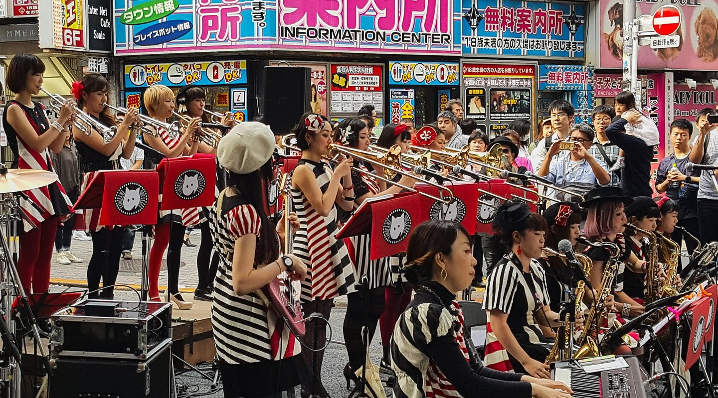 There is an annual street music festival in Shibuya, Tokyo, so you can guarantee a bit of heavy drum noise to go with the buzz of the weekend crowd. This particular jazz group were all proper players, and just one drum in sight. There also didn’t seem to be anyone hiding in the chorus, they all seemed capable of standing up and belting out a solo at any time. Add in the chic outfits and you’ve got jazz band smarts from top to bottom. There is a strong instrumental music programme in Japanese high schools, so it is not uncommon for people to say, ‘Oh, I used to play the trumpet a bit at school,’ or whatever, before zipping through some tricky scales at the local fete. 'Mixolydian, you say? Righto!'