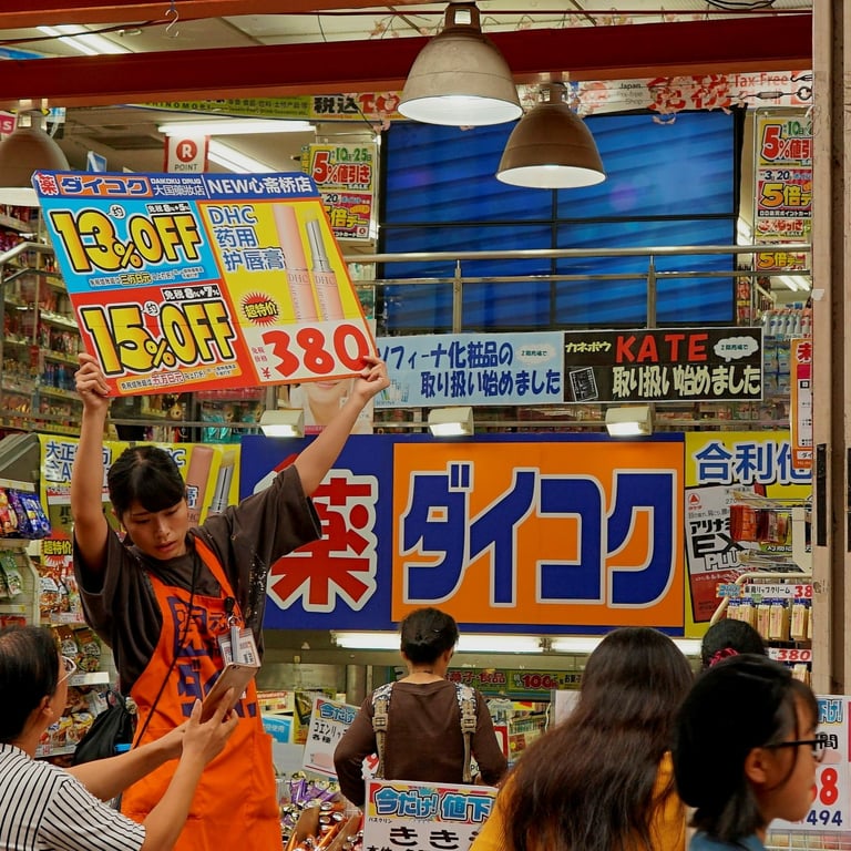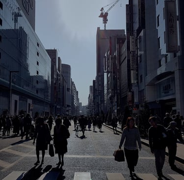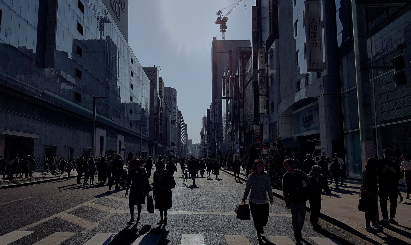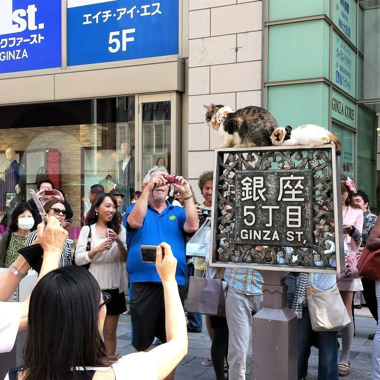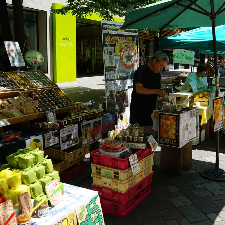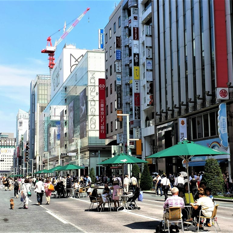 Ginza is an upmarket area in Tokyo, a kind of Bond Street. It's a place where the high-end brands originally staked out territory before they also made their home in the malls that came later. At weekends the main street is pedestrianized which makes for a perfect stroll in the sunshine or a sit-down if you are lucky enough to get a seat. Nearby market stalls provide for those who don’t feel like purchasing a Cartier watch. ‘No Omega today sir, how about a jar of marmalade?’