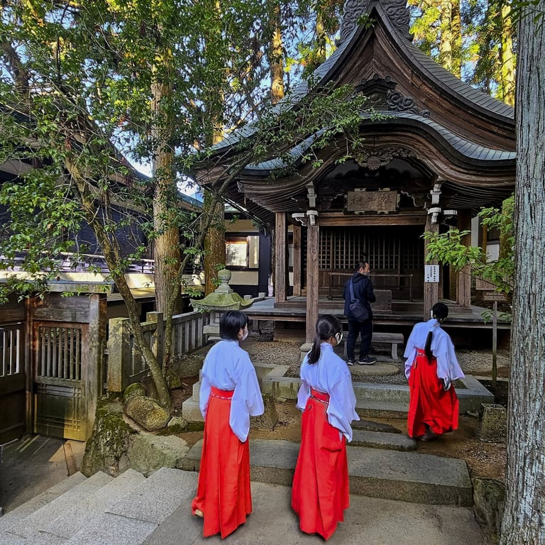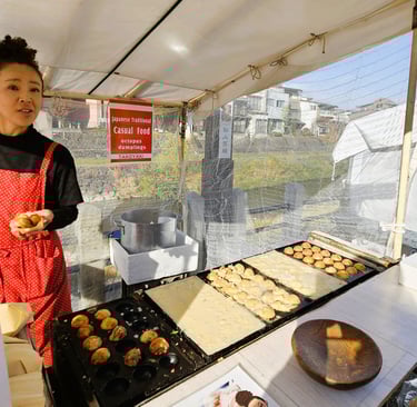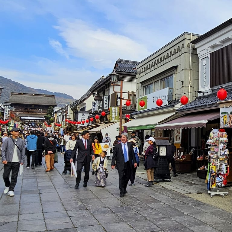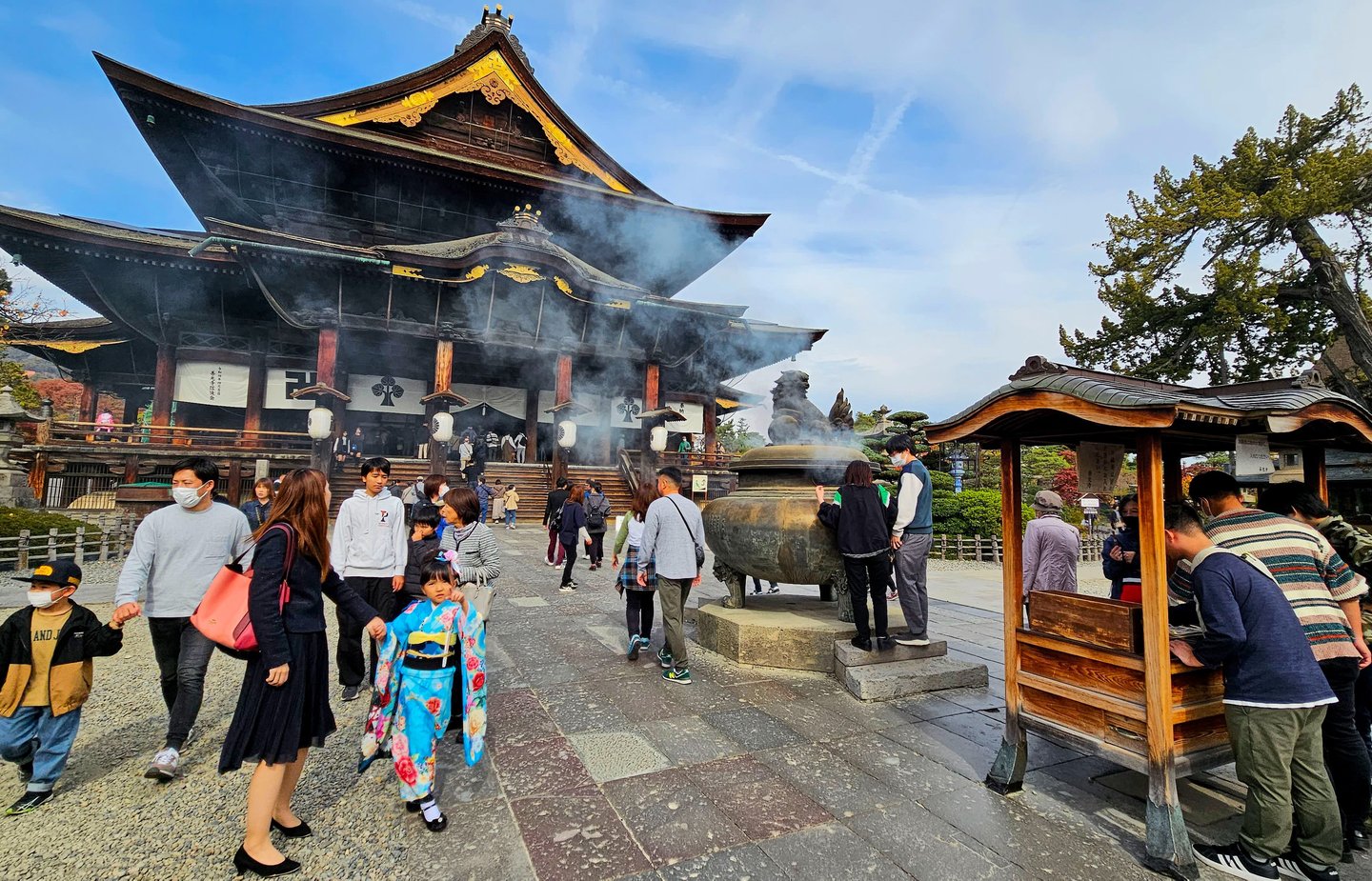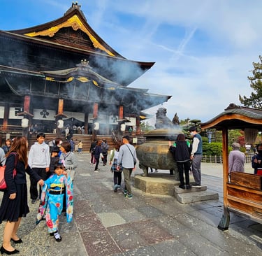 For atmosphere you can’t beat the buzz of a weekend crowd as it thickens approaching your intended destination. In this case, Zenko-ji Temple which dates from the seventh century and was the focus around which the original town grew. If it is a particularly famous shrine or temple, folks will have come from far and wide, having marked it in their diary weeks ago. The plus is that all the shops are open, and everybody is well turned out for the highlight of the month. The downside is that you may have to queue for that special prayer or blessing. Still, there’s an ice cream to look forward to, or the food speciality of the town whose aroma has been wafting across your path all morning – here it's Nagano, famous for its oyaki dumplings.