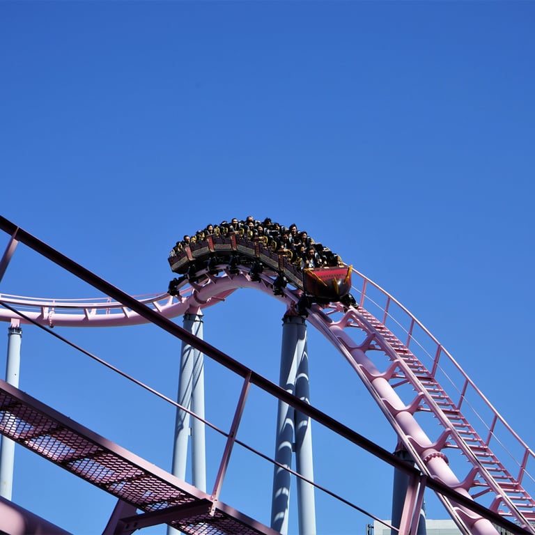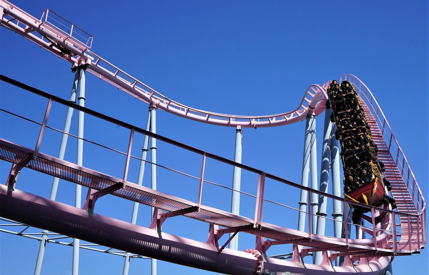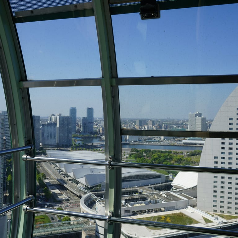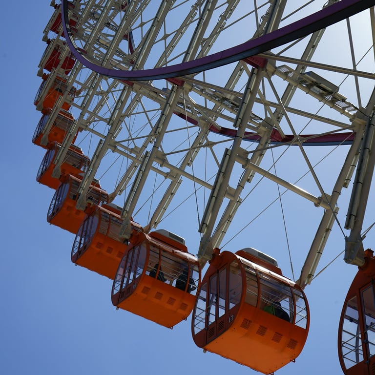 Standing in the queue for the ferris wheel at Yokohama’s funfair, one is made aware of the adjacent roller-coaster as it thunders by, the screams being carried away on the wind. As it whizzes round some tight bend or careens down some precipitous drop, you can sense how vulnerable the whole thing is. Only slightly comforting is the sight of the walkway next to the track, probably just for maintenance, but you never know, for an emergency as well. The ferris wheel is one of those old ones that stop to load up the carriages every thirty seconds. This leaves you suspended high up and making only staccato upwards moves. Very high up. I found the process all rather disconcerting, Will pass on that next time.