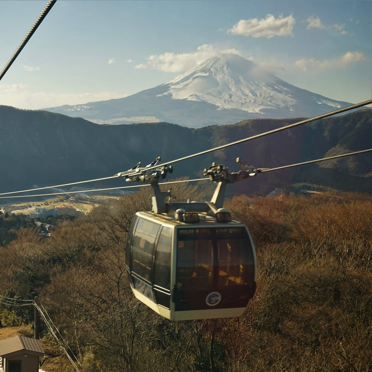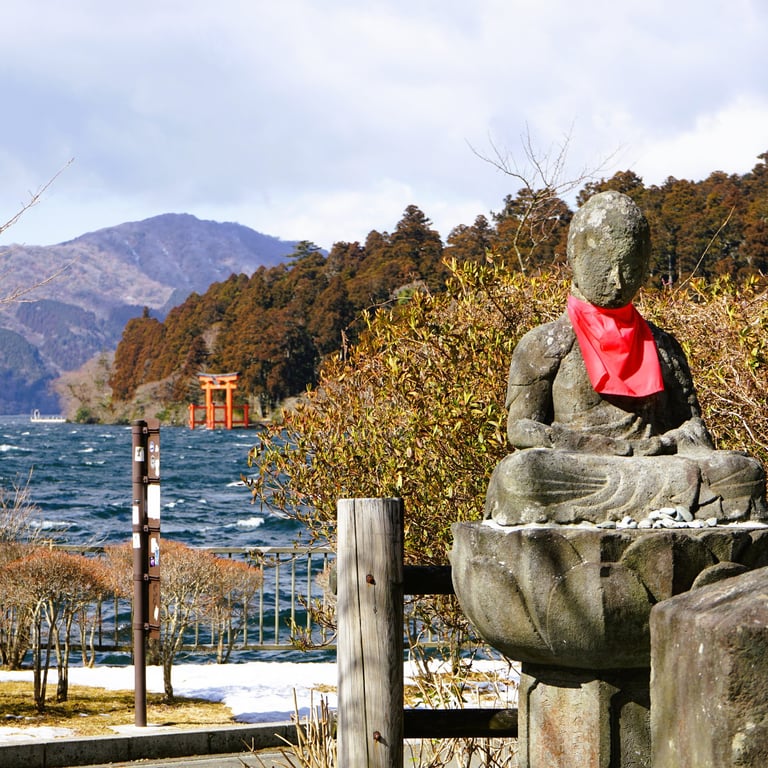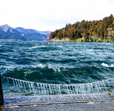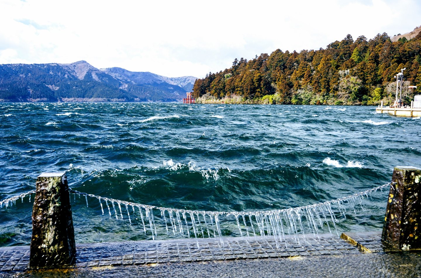 Hakone, west of Tokyo is a mountainous area by Lake Ashi. It offers trekking, hot springs, fumaroles, ropeway trips, boat rides and a skywalk. You are almost always in sight of Fuji-san as well. On this particular occasion in February it was bitterly cold, especially on the col connecting two cable-car rides. Most folks were huddled in the souvenir shop to escape the wind and the -10c degree windchill factor. Oddly enough the black ice-cream (volcano special) was doing a roaring trade.