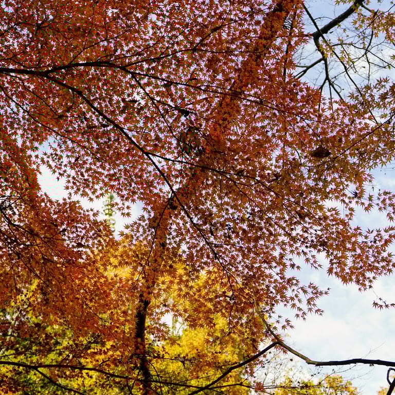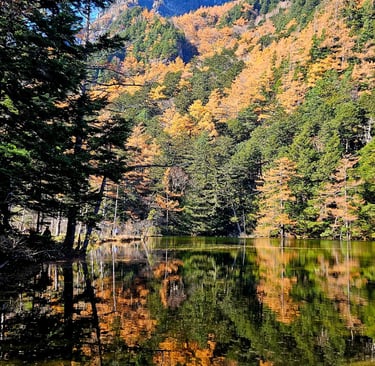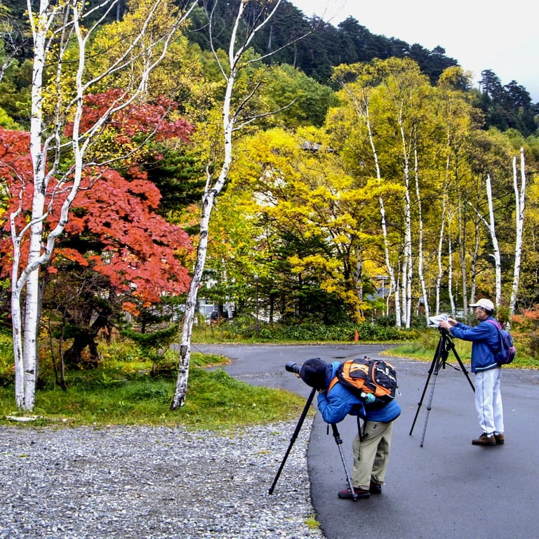 Kamikochi is a remote valley in the Hida Mountain Range. Although it was logged right up until the 19th century it is now designated a Japanese Cultural Asset and has become a centre for recreational hiking. Private cars are not allowed to enter the area, with access granted only to buses. The journey up there from Matsumoto during November is spellbinding as the bus makes its way through mile upon mile of winding valleys forested in all the shades of autumn. There are many trails to explore, much more than one day’s worth; so, camping is popular for those wishing to take in all the hiking options. Expect crowds of course, particularly around the Kappa Bridge viewpoint, but it's not too bad once away from the rest areas or eateries. On the trails it was quite easy to frame pictures without fellow walkers cluttering things up.
