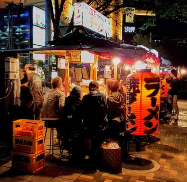 Fukuoka is famed for Yatai, mobile food stalls usually offering yakitori (barbecued bits and pieces). There is a street on Nakatsu Island in the middle of the river, where you can find the stalls, many catering for tourists. What I have found, and it is similar with the Golden Gai in Shinjuku, a row of alleys made up of tiny bars, is that the non-touristy ones are not particularly welcoming of foreigners. The idea is that regulars stop by for a bite, a drink and a natter after work. Using up three of the six seats with folks who can’t contribute to the conversation is probably the issue. Still, they do look endearing even if slightly off-limits. Also bear in mind is that it will be rather draughty sitting outdoors in winter - plastic sheeting is sometimes draped to ward off the chilly winds. Pictured here are folks all wrapped up in the month of October, and the riverside at dusk.