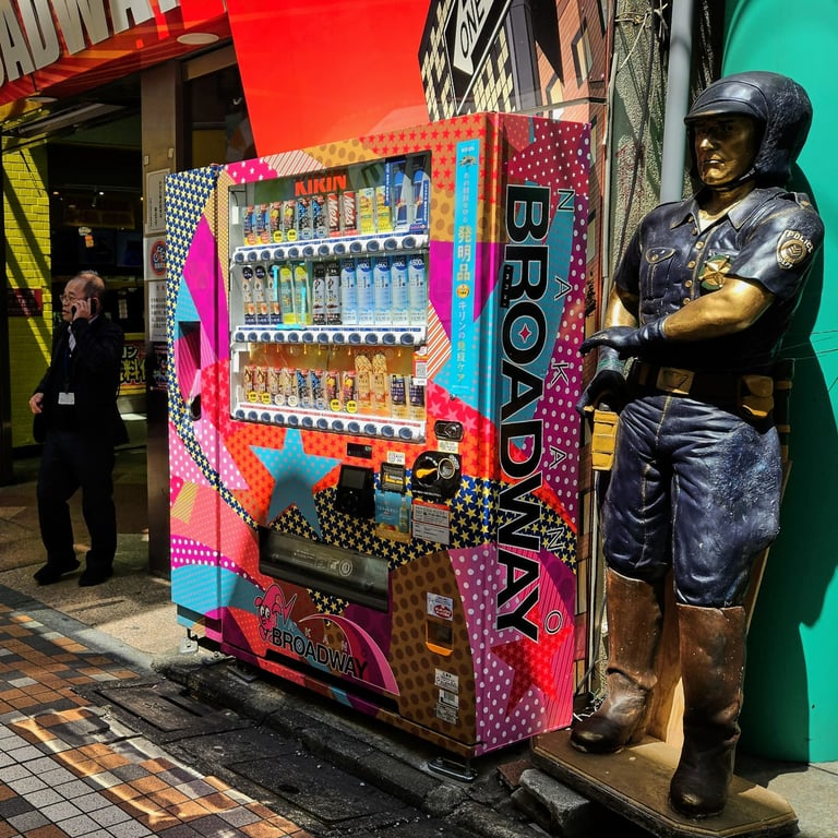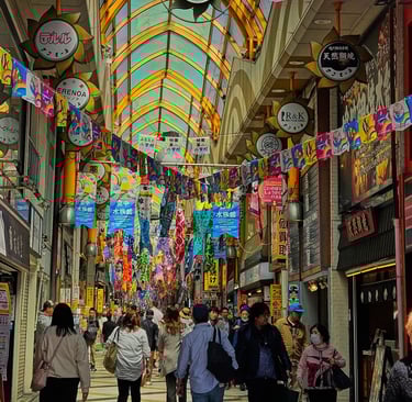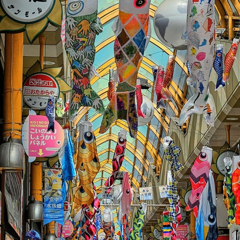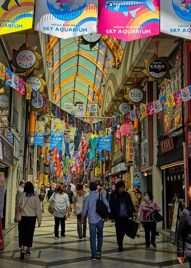 Nakano is just another stop on the labyrinthine rail network that is Tokyo (take the Chuo or Sobu Lines). Or it could be, but for the most splendid shopping arcade called Nakano Broadway, which begins as soon as you exit the station. Perhaps it was the additional colour provided by the Koinobori fish banners, or just the tint of the glass roof panels in the bright sunshine, but the vibe was well and truly uplifting, even for non-shoppers like me! Every few outlets served food or coffee as did the side-streets, so it was definitely a win-win.
