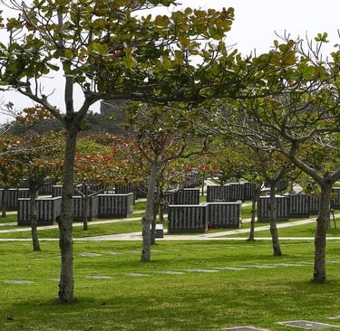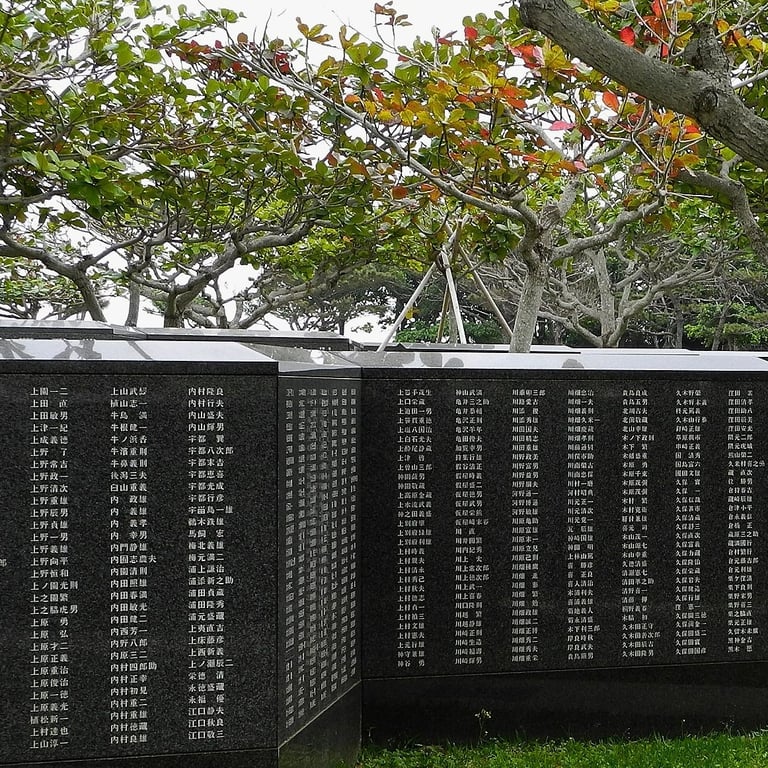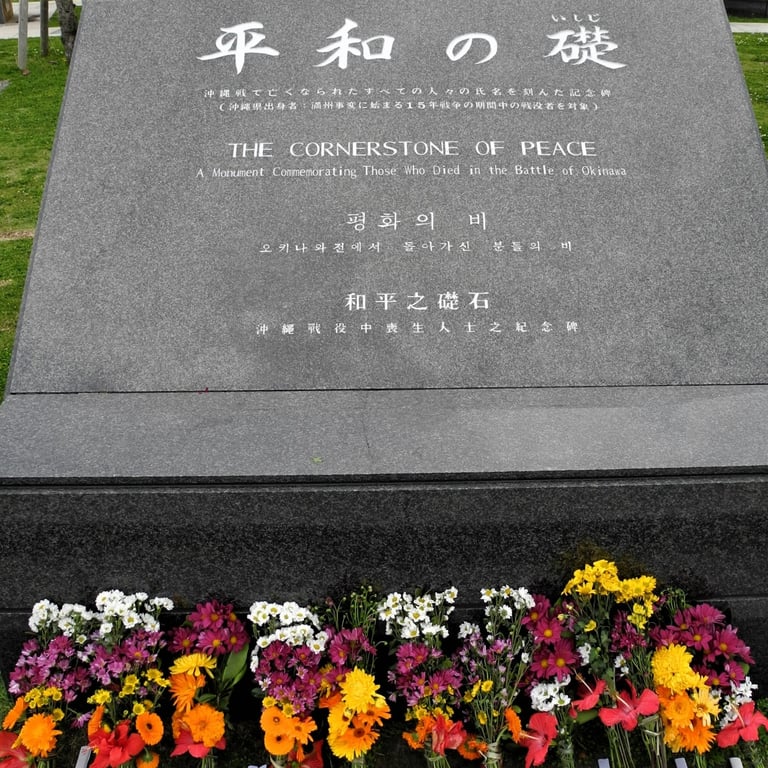 Okinawa for a week or so was a disappointment. Probably because we stayed on the main island rather than the outlying tropical islands, besides the weather was largely overcast all the time. The highlight (a rather sombre one) was a visit to the Peace Memorial Park south of Naha. Here, over 240,000 names of those who lost their lives in the Battle of Okinawa, are inscribed in the zig-zag granite memorials. The names are in Japanese, Korean or English script according to the deceased's nationalities. A very sobering experience with the Cornerstone of Peace providing a focal point.