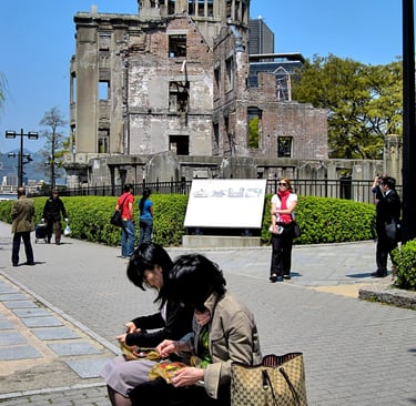 Exiting the station in Hiroshima following my Japanese map (pre-smartphones) I was confident that I would find the Peace Memorial fairly easily. Having walked straight out of the wrong exit, it didn’t exactly go to plan. Later, strolling along the riverside in the spring sunshine past boughs laden with sakura and office workers snacking from their lunchboxes, it was difficult to fathom it all. The many juxtapositions rattled the senses. What had gone before and what it was like now - there was simply so much to absorb. All you could do was quietly contemplate, there was really nothing to say as you took it all in. The museum was busy that day, also busy with silent people.