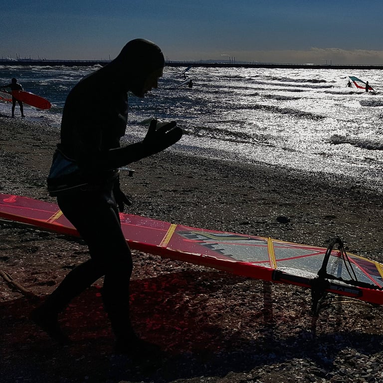 Down the road from where I lived was a coastal stretch which was good for a walk, cycle or a coffee. Occasionally the wind would get up and the windsurfers would materialize right on cue (everyone checks the weather in Japan every morning, so they know what to wear when setting out from the house). Full marks to those guys tearing back and forth in the freezing sea. Such intrepid folks! The photos, being backlit, also capture the elements in play on that icy February morning. It was such a clear day that you could see Fuji-san on the skyline 160 kms away across the bay (top pic)! If you find yourself out that way (it may be that you are staying locally for a conference or exhibition at Makuhari Messe or that you are visiting Disneyland, a few stops away), you could have time for the coastal path which stretches for three kilometres all the way to Kemigawahama Beach where these photos were taken.