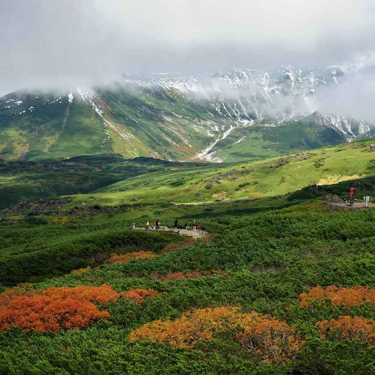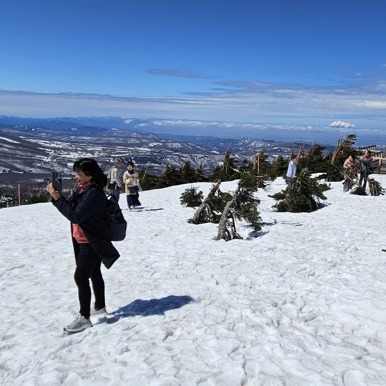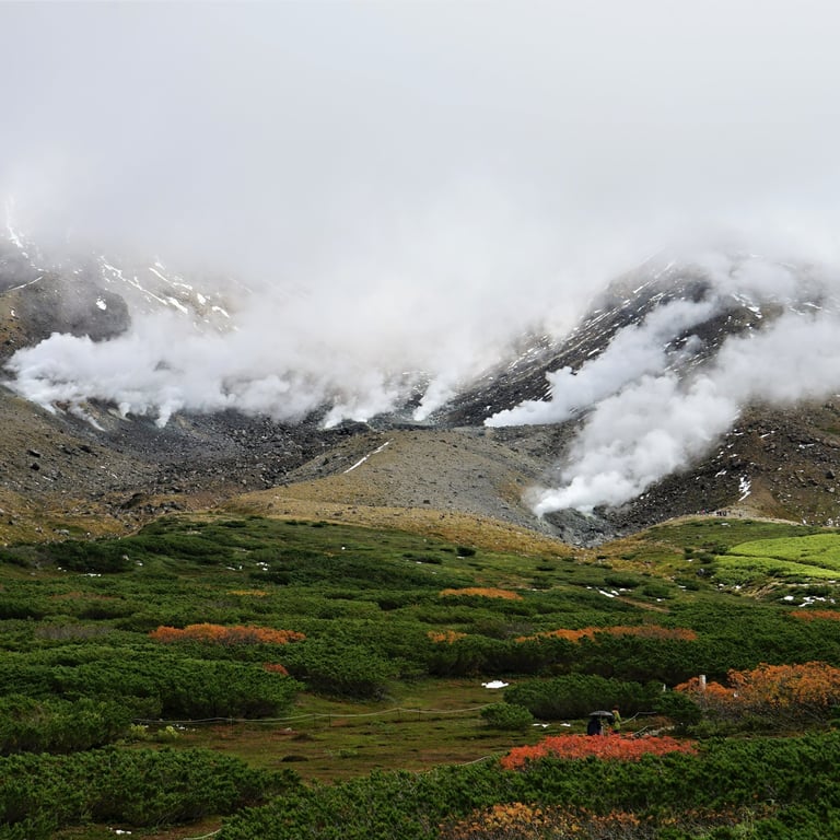 The great thing about ropeways in Japan is that they give you majestic views over the most dramatic of landscapes and deposit you in places that would otherwise be off-limits. Asahi-dake in the Daisetsuzan Range in central Hokkaido is a case in point. Over 7,500’ high, it was last active in 1739, but the constant hiss and splutter of the fumaroles would have you believe otherwise. Hardy folk abound everywhere in Japan, ready to exit the gondolas and tackle the highland pathways in any season and in all weathers.