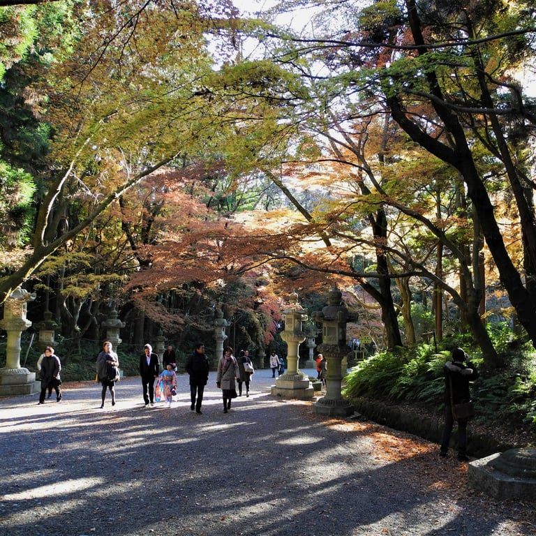Sawara is a former merchant town from the Edo period (1603-1867). Water transport founded its wealth, with the canals still pretty much as they were. Streets are lined with the old trading houses, which makes for a period-piece feel as you walk around. You can get there easily by train from Tokyo, Chiba City, or Narita. Katori-Jingu Shrine, atop a hill, is a bus ride away from Sawara and well worth a visit. On this occasion in December, a bitter wind kept folks alert at the bus-stop, hopping from foot to foot (a kind of 'given' for bus shelters world-wide). Fortunately, it was relatively calm up at the shrine.