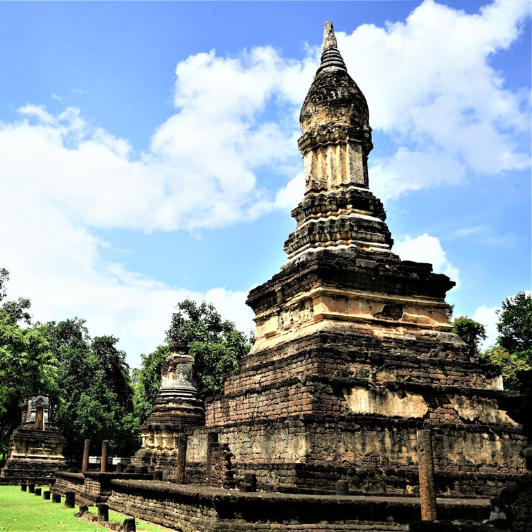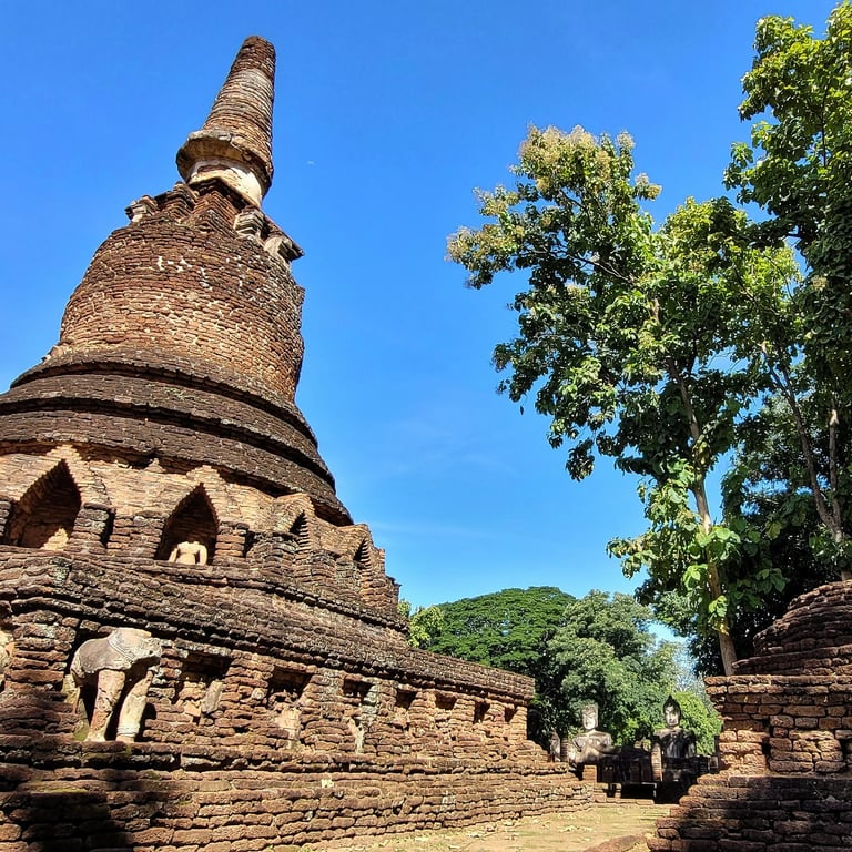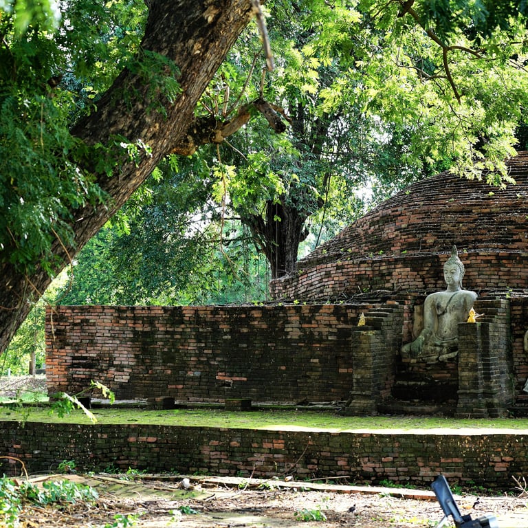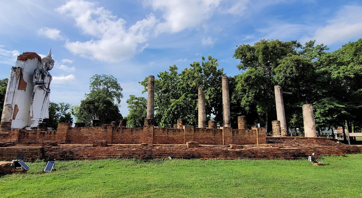 When you drive between Bangkok and Chiang Mai you are on Highway 1 for a fair distance. About half-way up the country you pass signs for Kamphaeng Phet, but you are on a mission so you never detour to take a look. This time it was part of the plan – stop for one night near Kamphaeng Phet Historical Park! Not only was the site fantastic but, just after covid travel restrictions had been lifted, there was nobody else there. Literally nobody but us. What good fortune to wander unhindered amongst 13-15th century ruins dating from the Sukhothai period and have it all to oneself. Not only were the antiquities in excellent condition, but they were also situated in beautifully landscaped grounds. Chalk that one up as a win-win!
