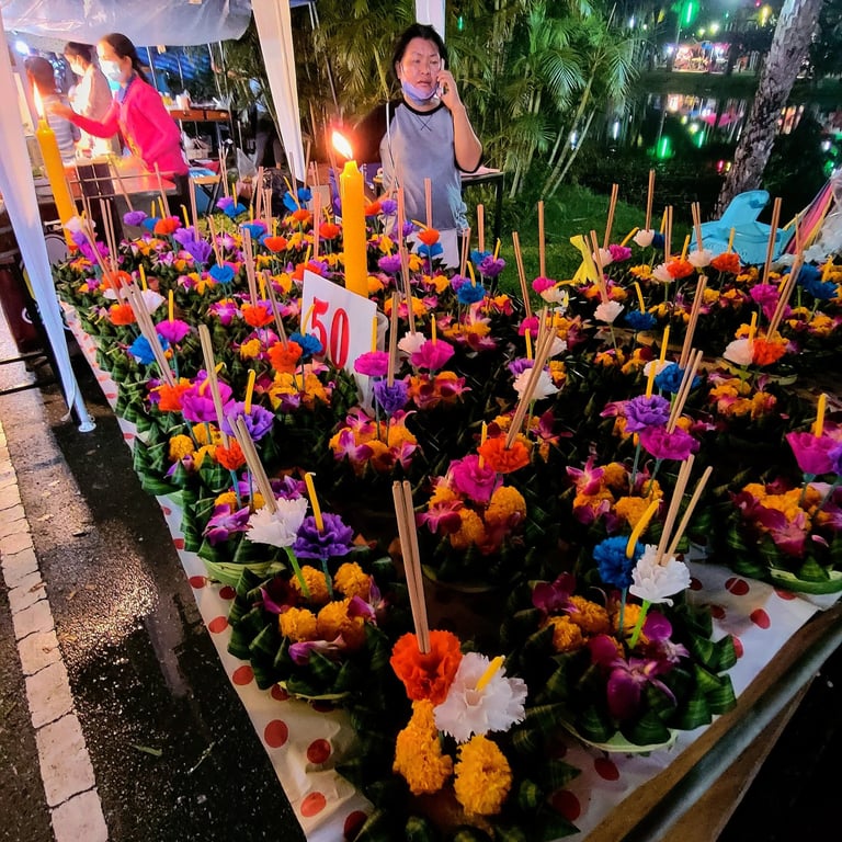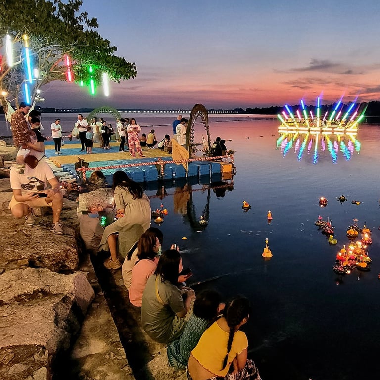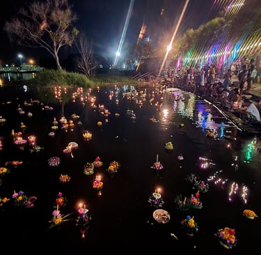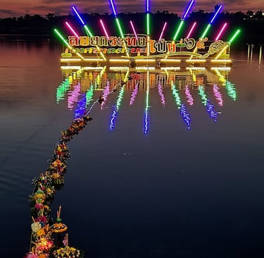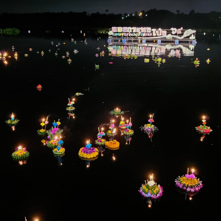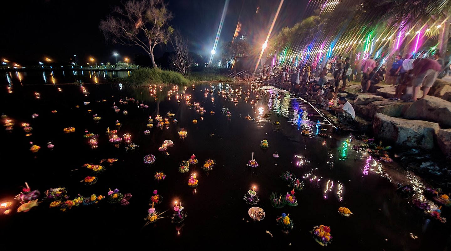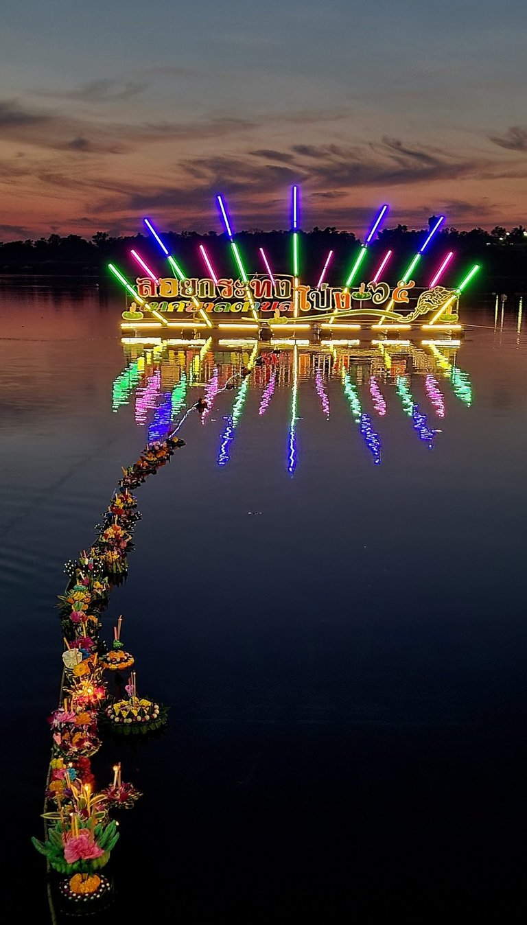 Your krathong is a banana trunk garland that is floated on the local lake, river or in the sea to take your cares away, ready for a new lease of life. There are candles and joss-sticks on the krathong, along with a few coins and, if you are serious about wishing to garner good fortune, a few of your personal fingernail-clippings. Krathong competitions take place to make the most elegant offerings and even the fifty-baht ones represent some earnest handywork. As an occasion it is colourful, elegant and calm. Down at the local pond there is some serious shoo-splashing of the water to make sure your own krathong gets a good start as it heads off into the night. The chatter at the water’s edge gives a real community feel to the evening – perhaps everyone is anticipating all the good luck that is about to come their way. You can seek the festival out at any nearby lake or river. For a special occasion head for Sukhothai, or go down to the Chao Phraya for a riverside spectacular with fireworks. (Pics here - Mabprachan Lake)