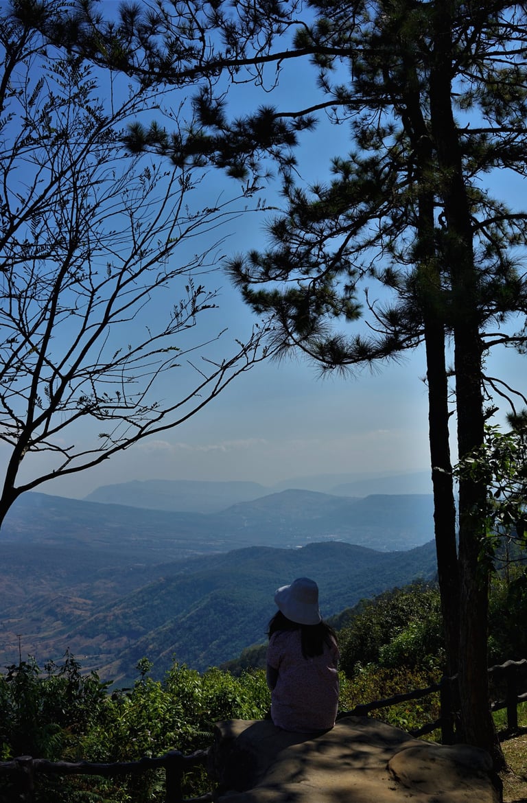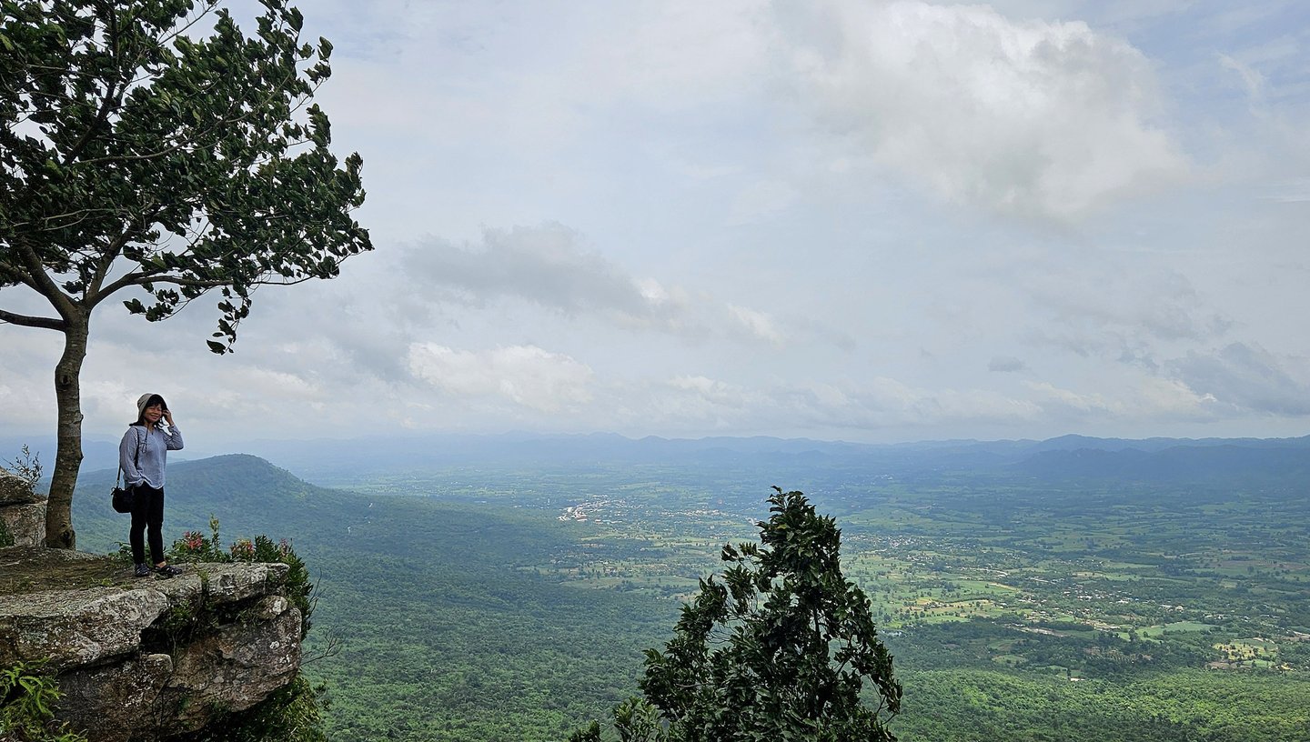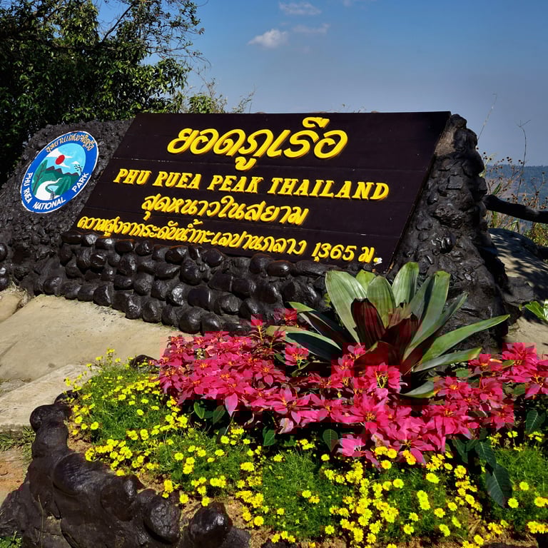 Phu Ruea is a plateau in Loei Province with a peak of 1,365 metres (4,478 feet)). Lying in the Phetchabun Range, it is part of the Phu Ruea National Park close to the border with Laos. The peak is popular with tourists for the chance to see sunrise and low-lying clouds, as well as experiencing year-round cool temperatures. The approaches to the plateau present a table-top vista before the road turns this way and that as it climbs to the top. The parking spot leaves a short walk of about 1.5 kms to the viewpoint, although there is also the option of a buggy-cart style bus. Fresh air and distant views await you.