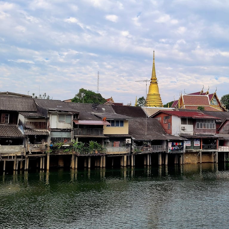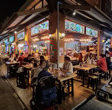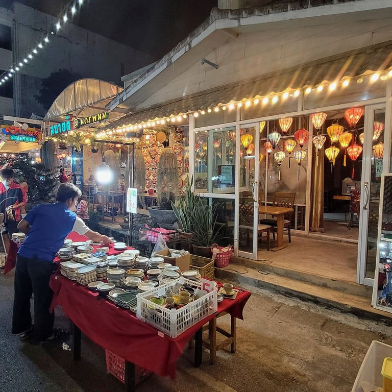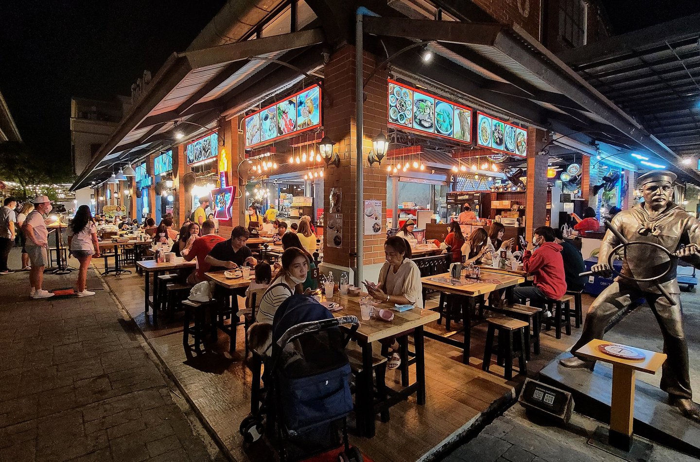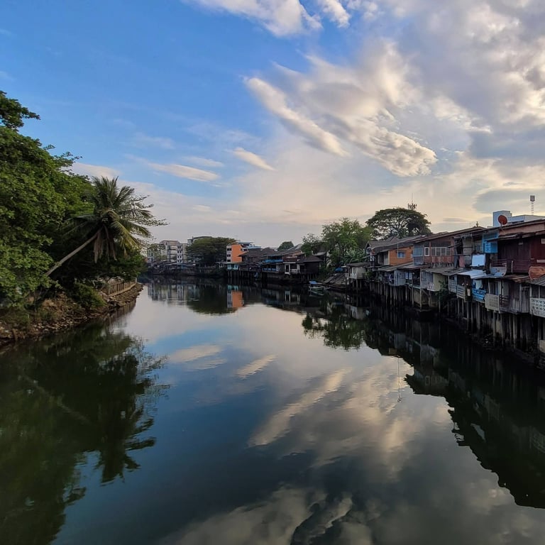 Khlong Ong Ang in Bangkok is a rejuvenated canal-side area near Chinatown. On the towpaths either side there are lines of stalls selling craft-type wares and clothes, along with sit-down restaurants. Live bands, buskers and street art all contribute to the lively vibe, as does the evening lighting. The part that puzzles me is that you can rent a canoe to glide up and down, but the water looks black and toxic, certainly not the place to practise your kayak-roll. Each to their own, I suppose!