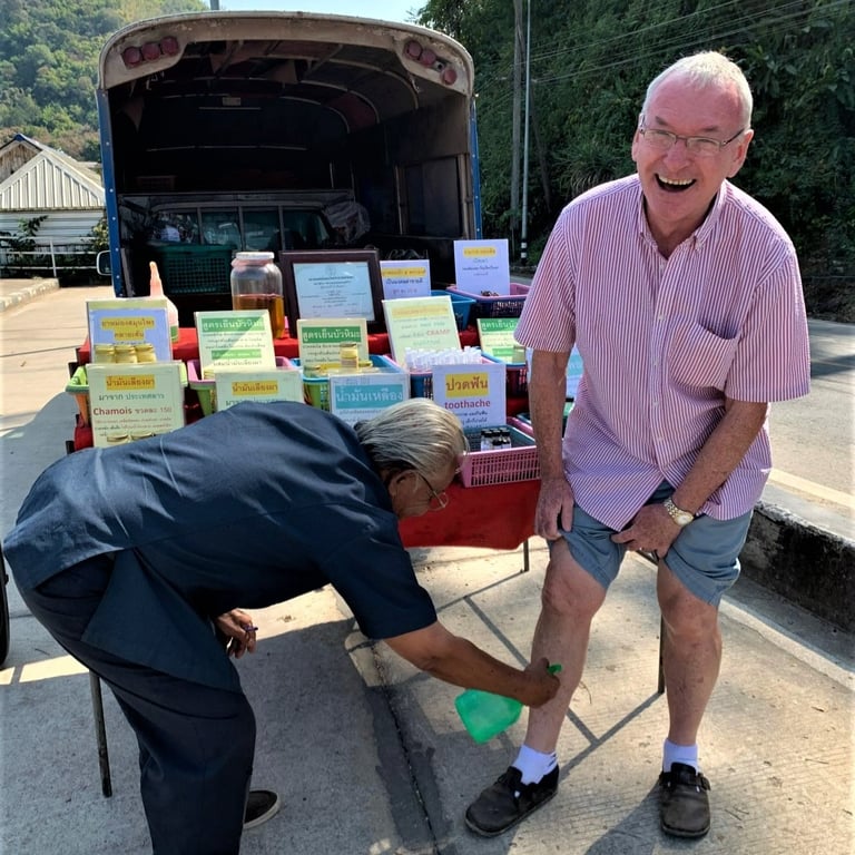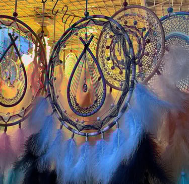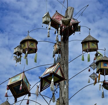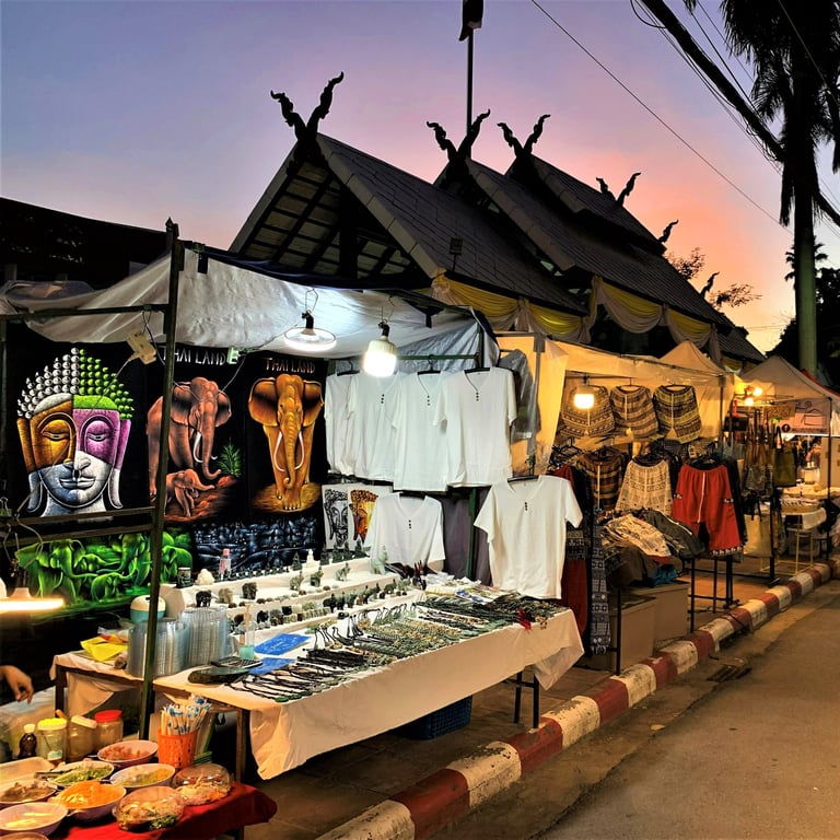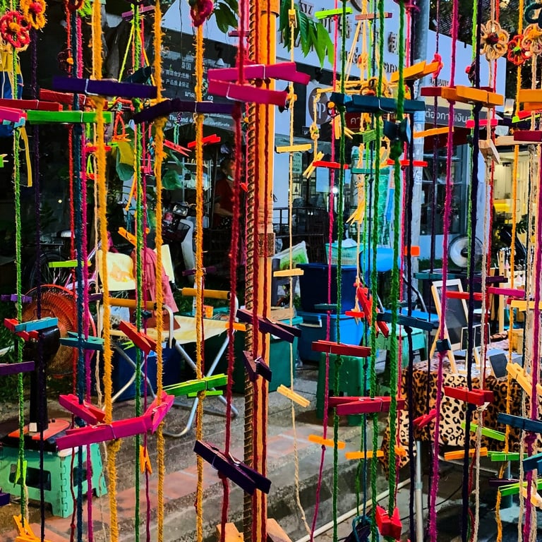 Chiang Mai has two weekend markets, Wualai (Saturdays) and Thapae (Sundays). These 'walking streets' are miles long and you can guarantee that they will be hot, humid and busy. Folks amble along in one direction either side, glancing at the stalls perfunctorily, apart from the customary few people who go against the flow, barging their way through. Luckily foot-massage stations occur regularly and there are heaps of food stands. I don’t know if it is just me, but I never seem to buy anything at these markets; perhaps it is because I bought the local craft fare forty years ago, so now I just look straight past it. Dream catchers like these would send your cat into a frenzy. Best place them high against the wall ready for videos of cat fails of leaps and splats.
