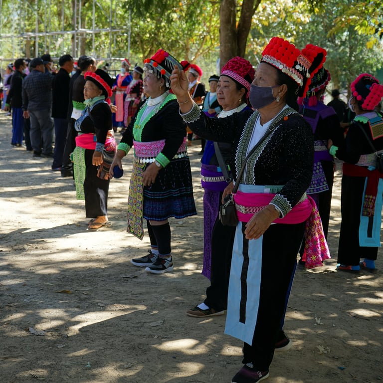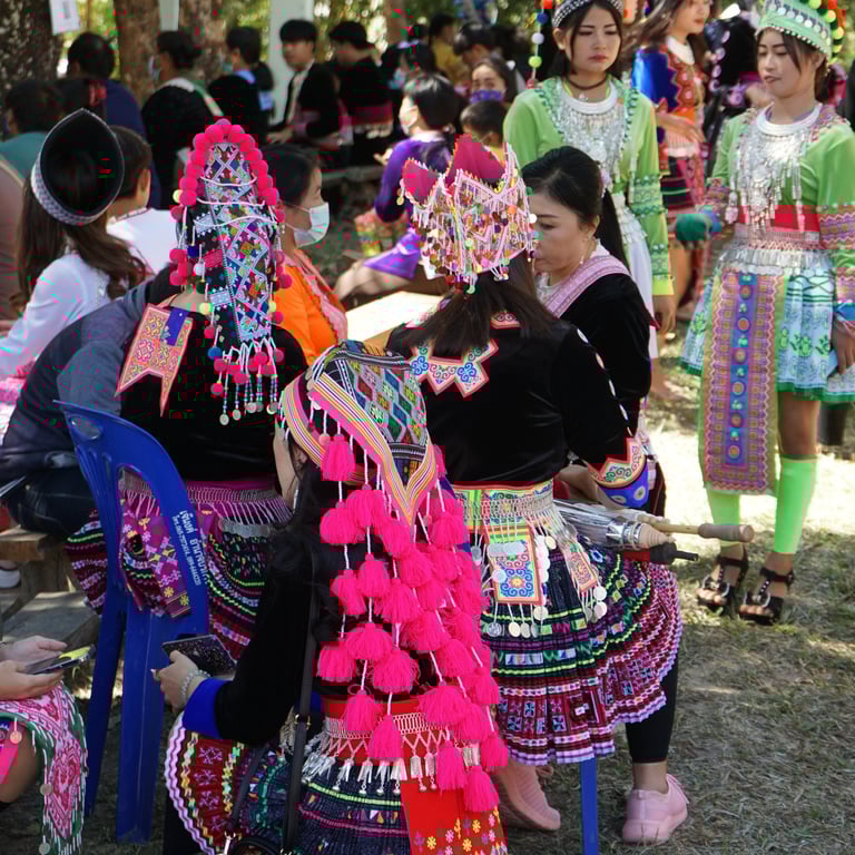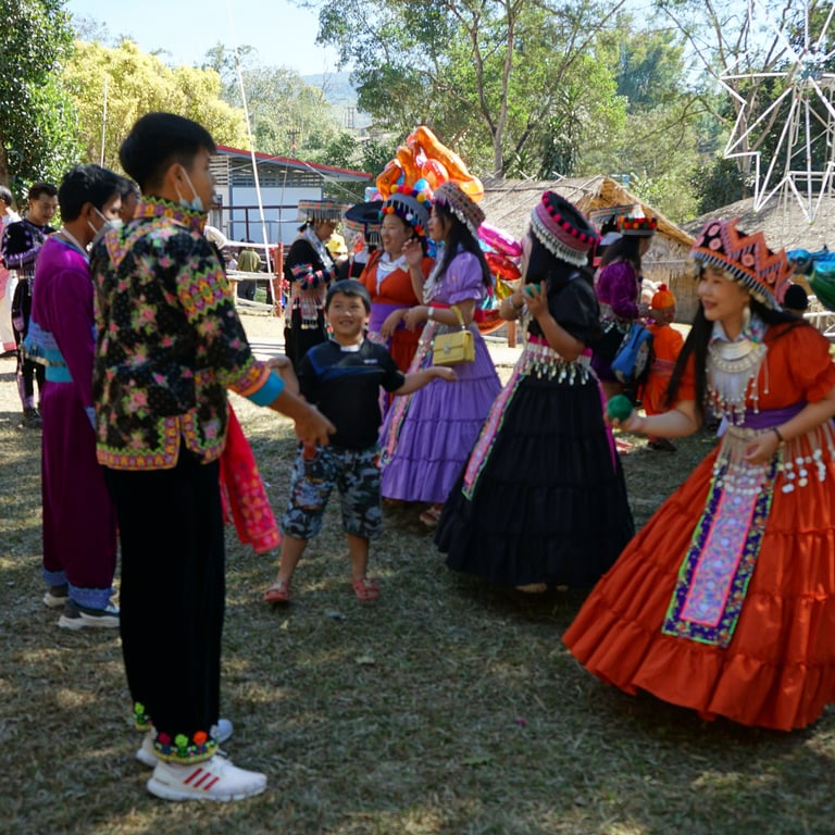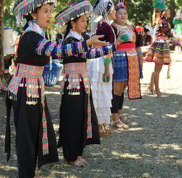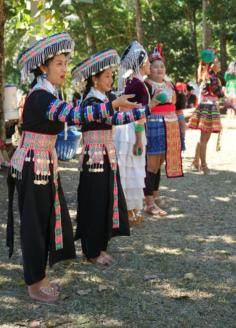 The Hmong New Year is celebrated in January after the rice harvest. It is a time when ladies don traditional dress and play a game called Pov Pob or tossing the ball. Girls from the age of 15 can participate, the idea is that the game acts as an icebreaker to help find a suitable match: ‘Throw the ball and catch a husband.’ If you don’t strike lucky you can always try again next year. What happens to the very nice person who can’t catch for toffee? Seemingly an ornament was given to Ms Butterfingers, then the potential lover had to sing them a love song to win it back - although tape recorders were used in modern times - boo! As for the older folks here, apparently you play pov pob each year to remind yourself of that first time, when you fell in love.