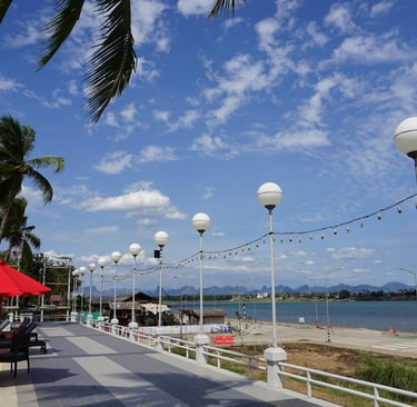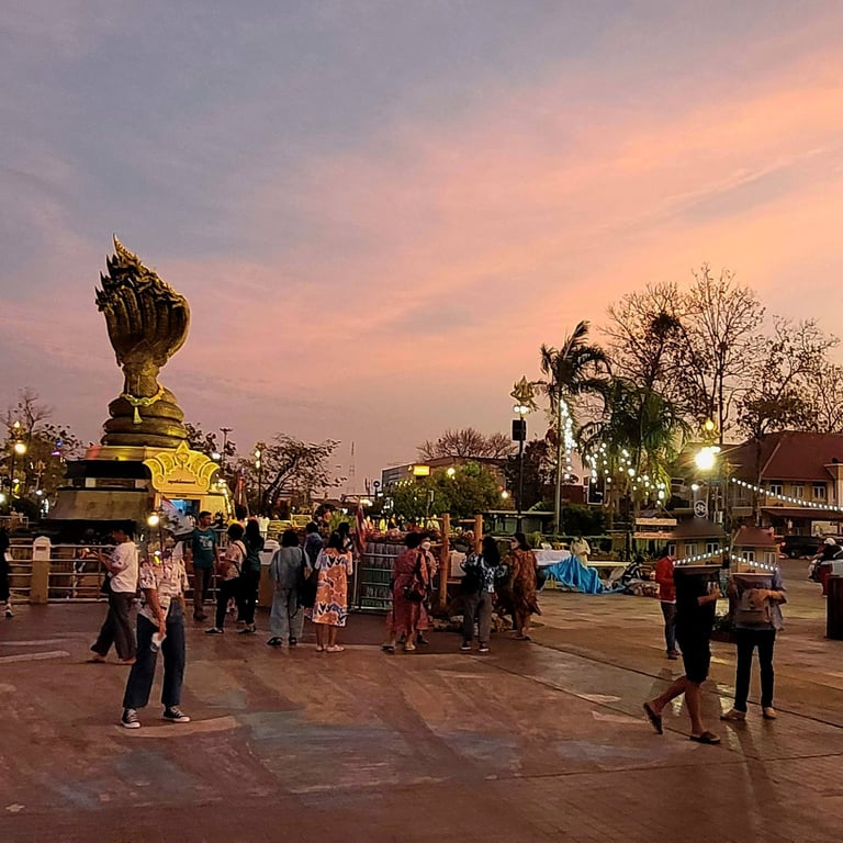 The town is in the far north of north-eastern Thailand on the Mekong River. In fact, it is so far north that it is geographically north of Vientiane in Laos. The riverside location, with rugged Lao mountain peaks in the distance, makes for a picturesque setting giving the appearance and feel of being at the seaside. This is enhanced by a corniche and boardwalk that runs for miles. In town there are bars and restaurants to go with the evening market, whilst down the river there is a weekly market of local fare. You can hire a bike to cruise up and down at sundown while a strong Mekong breeze will test your stamina. The town centre-piece is the Naga statue that looks over the river.