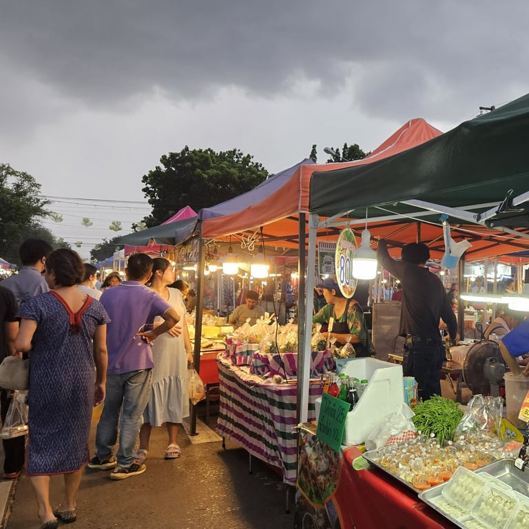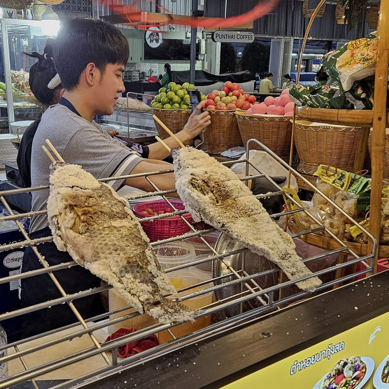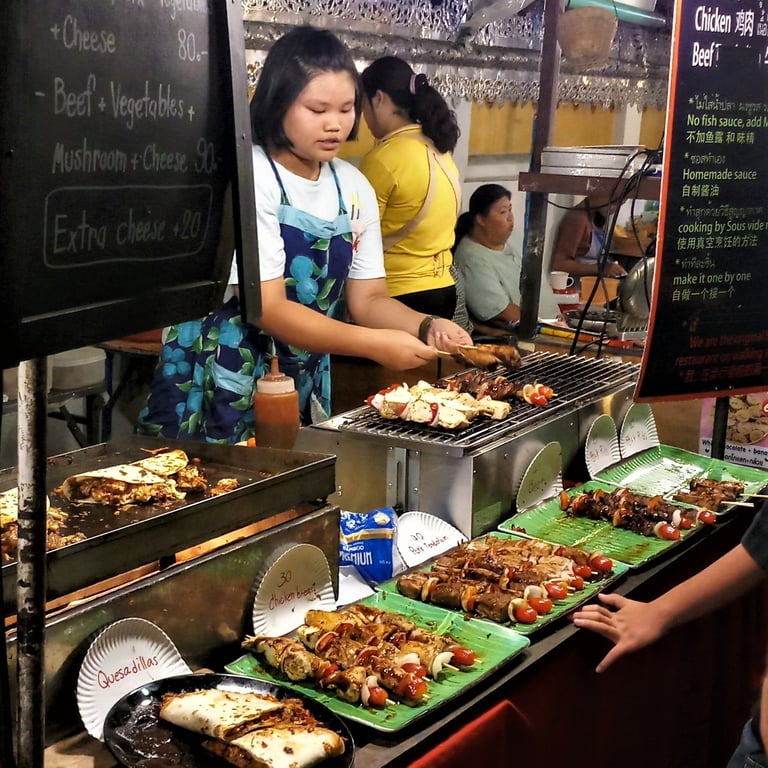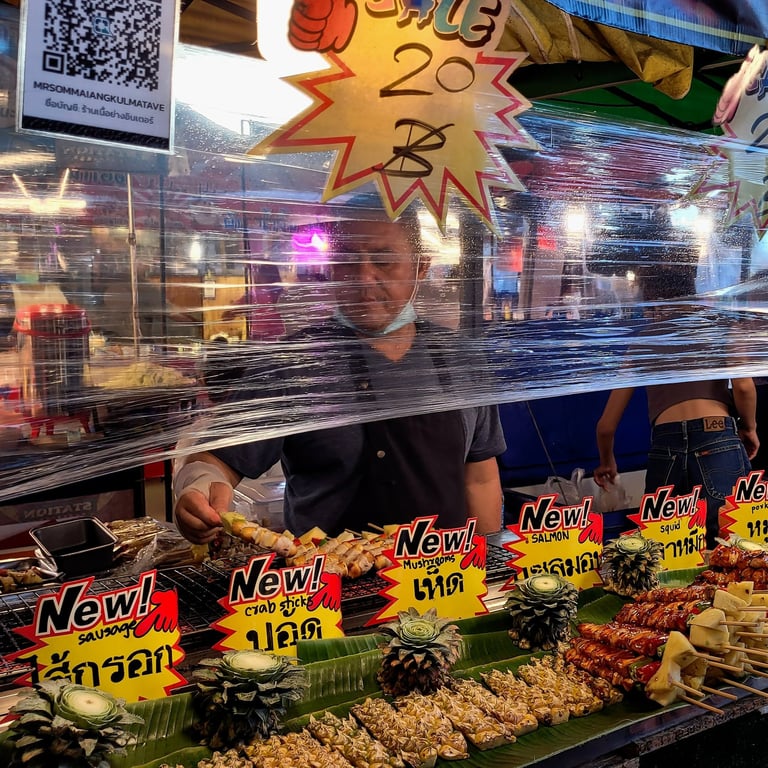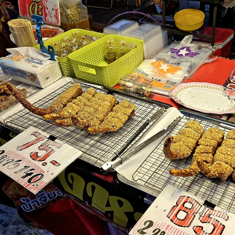 Generally, I don’t go for pre-prepared market food. It is usually deep-fried or full of sugar and MSG, or the meat cuts are mainly fat. I just find it unappetising. What you are used to I guess – I will also never get used to a bag of insects or grubs! Sometimes though, the quality is clearly up a notch or two, like with these kebabs at the Train Night Market (Talat Rod Fai) at Srinagarindra, Bangkok. I assume that this is because it is not just a local market; folks come from far and wide to one of Bangkok's famous, train markets, so the ingredients seem to be a better cut. A few of these will keep your spirits up if you are wilting after traipsing round the stalls.