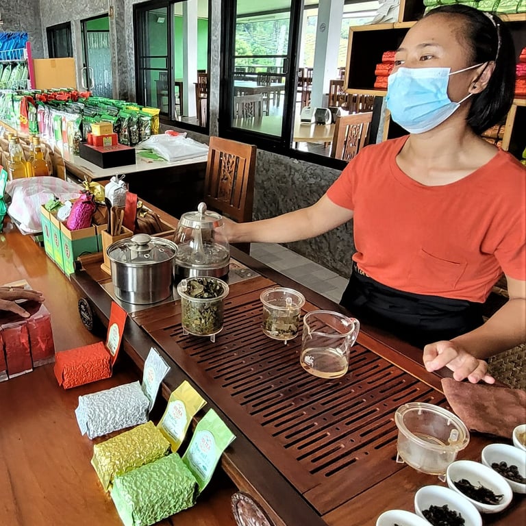 Up near the Myanmar border in Chiang Mai Province is the tea country of Mae Salong. A community of some 15,000 Kuomintang soldiers and their entourage was established there following the escape from the post-WWII conflict in China. Initially narcotics were grown but the Thai government promoted a switch to alternative cash crops, including tea. The landscape now features plantations with the typical symmetrical rows of tea bushes. You can also try out any number of the tea varieties at the tasting centres. Can you tell the difference between Oolong No.12 and Oolong No.17? I couldn't!
