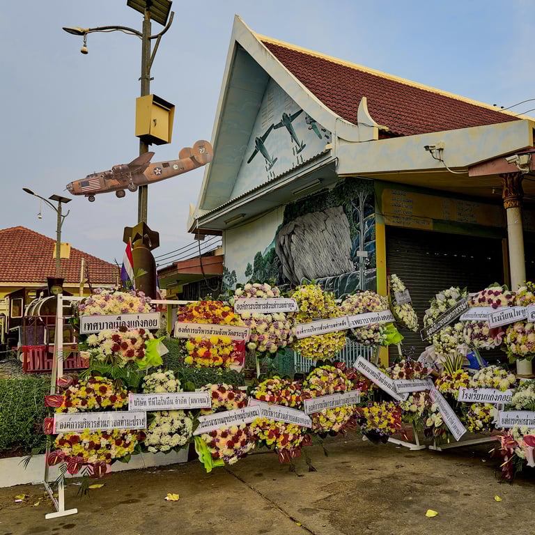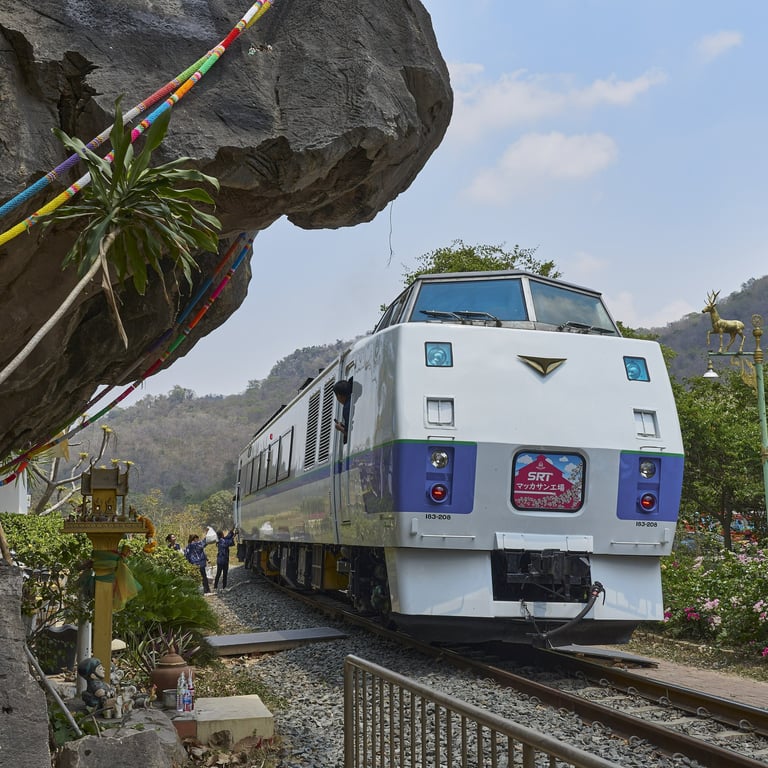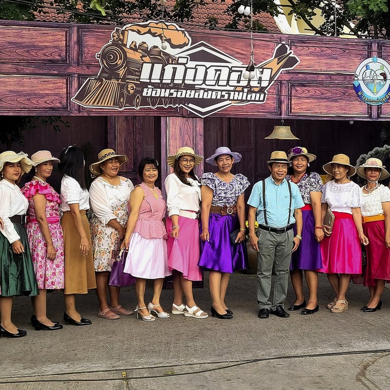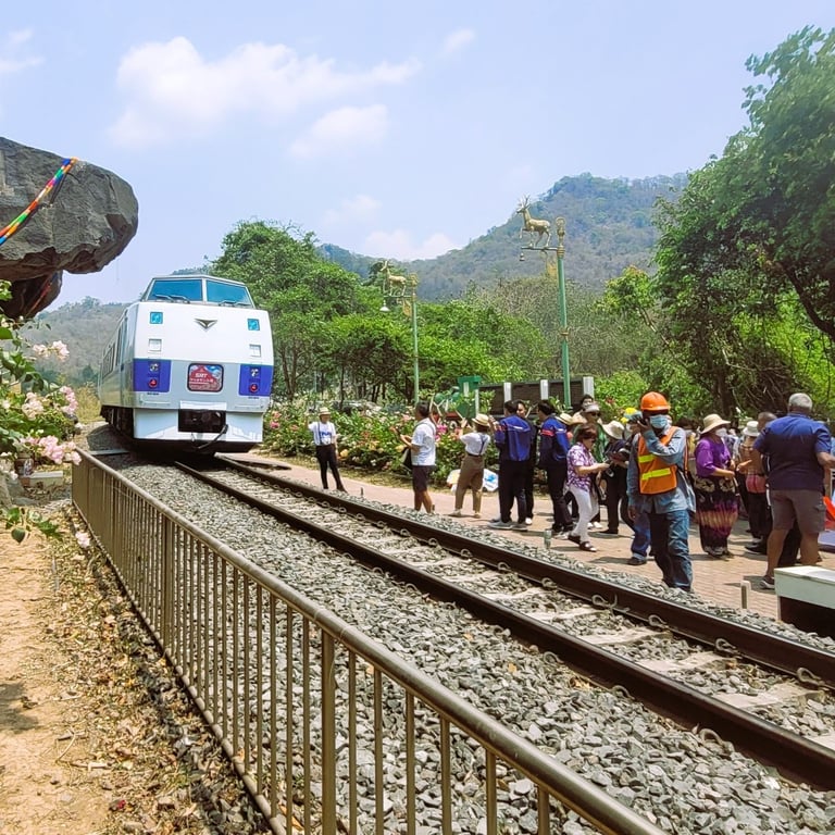 Kaeng Khoi is in Saraburi Province, north of Bangkok. On 3rd April 1945, Canadian B24 bombers flew from Burma to destroy the Japanese railway marshalling yards at Kaeng Khoi Junction. As is still the case, many dwellings were located next to the railways, and tragically there were 200 civilian fatalities that night. The town now holds a festival on 2-4 April each year to commemorate that fateful day and pay homage to lives lost. There are craft stalls, food stands (hundreds more in the market over the road), and live bands. The crowning glory is a sound and light show across the river. To add to the spirit of the occasion, folks dress in period costume, which for ladies is usually a floral frock and straw hat, and for gentlemen - fedoras, white shirts and braces to hold everything in place! This trip was with the KiHa 187 excursion train.