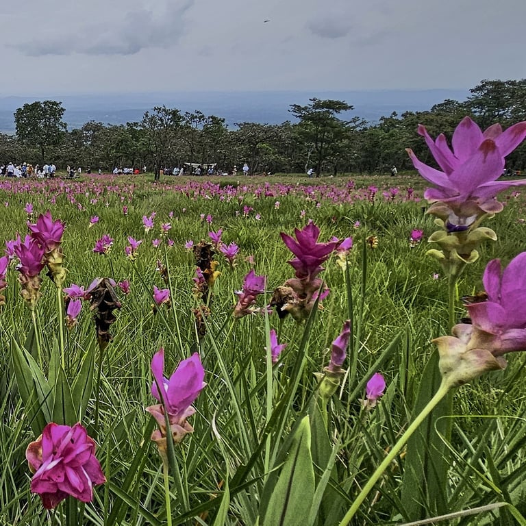 Walking along the clifftop in blustery conditions it wouldn’t take too much effort to topple over the edge, despite the many park rangers stationed to prevent just that. The cliffs at Sai Thong National Park, Chaiyaphum are an absolute natural for those seeking an Insta thrill. A couple of kilometres further along the cliffside track are Bua Sawan 1 & 2. These are the names of the fields full of wild Ginger Flowers (Dork Kratchiao in Thai), which will be the main attraction for many. This trip was during the month of July, ideal for catching the flowers in bloom.