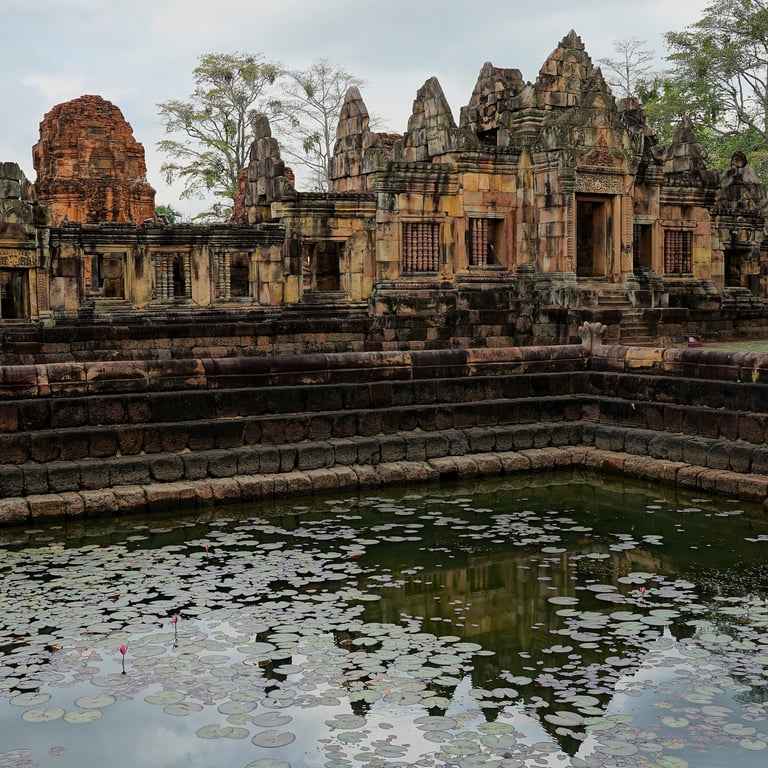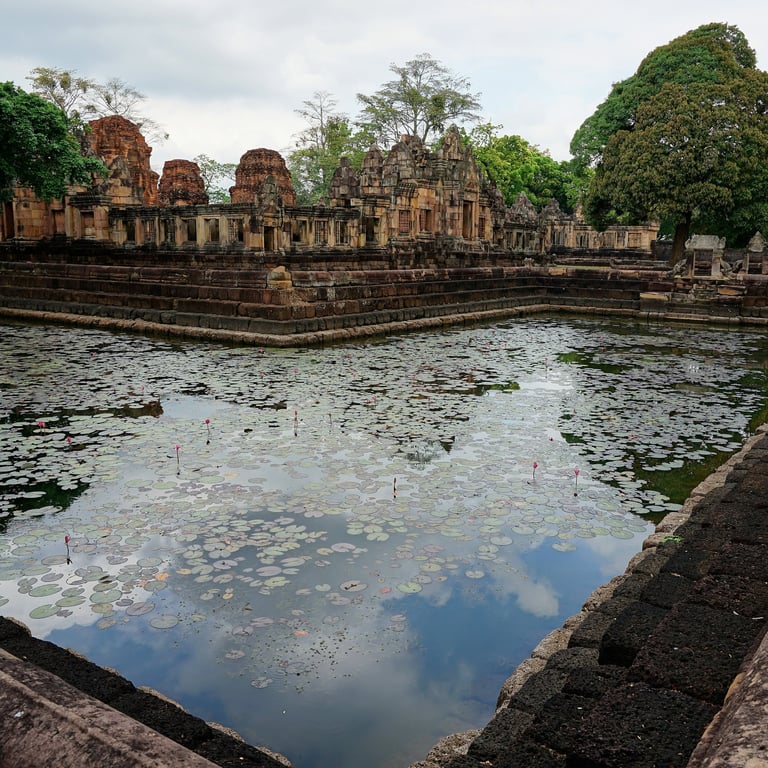Prasat Muang Tam in Buriram Province is not far from the Cambodian border. This Khmer temple dating from the 10-11th centuries, is thought to have been an administrative centre, with the surrounding symmetrical barays (ponds) having a ceremonial function. Walking around, the site exuded a calmness. It may have been due to the sandstone antiquities or the fact that it is rather out of the way, attracting just a smattering of visitors – not even enough to wake the sleeping dogs!