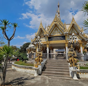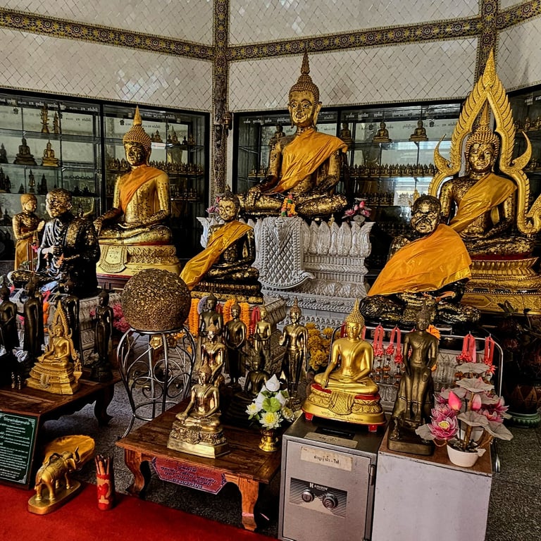The wat originally dates from the Ayutthaya period when it was called Wat Thong. Situated on the Bangkok Noi canal, it is now known for two different reasons. The first is that it was the site of executions of captured Burmese soldiers. This led to the reporting of ghostly hauntings and was compounded by the discovery of groups of skeletons when building the school next door. How to banish the errant spirits? The solution was to build a spirit house for Thai deceased militaries and charge them with controlling the enemy souls. Obvious, really. The second reason for fame predates and postdates this event. Rama III, overseeing renovations, commissioned the two most famous painters of the day, Kru Thong Yu and Kru Kong Pae to create competing murals on opposite walls in the ordination hall. Who won? It’s hard to say, considering the 360-degree splendour, but their efforts are said to be 80% intact and were used as an inspiration for the opening titles of the recent White Lotus 3 series on Netflix. The wat can be reached by long-tail boat or, it is a short walk from the Bang Khun Non MRT Station - past the school!